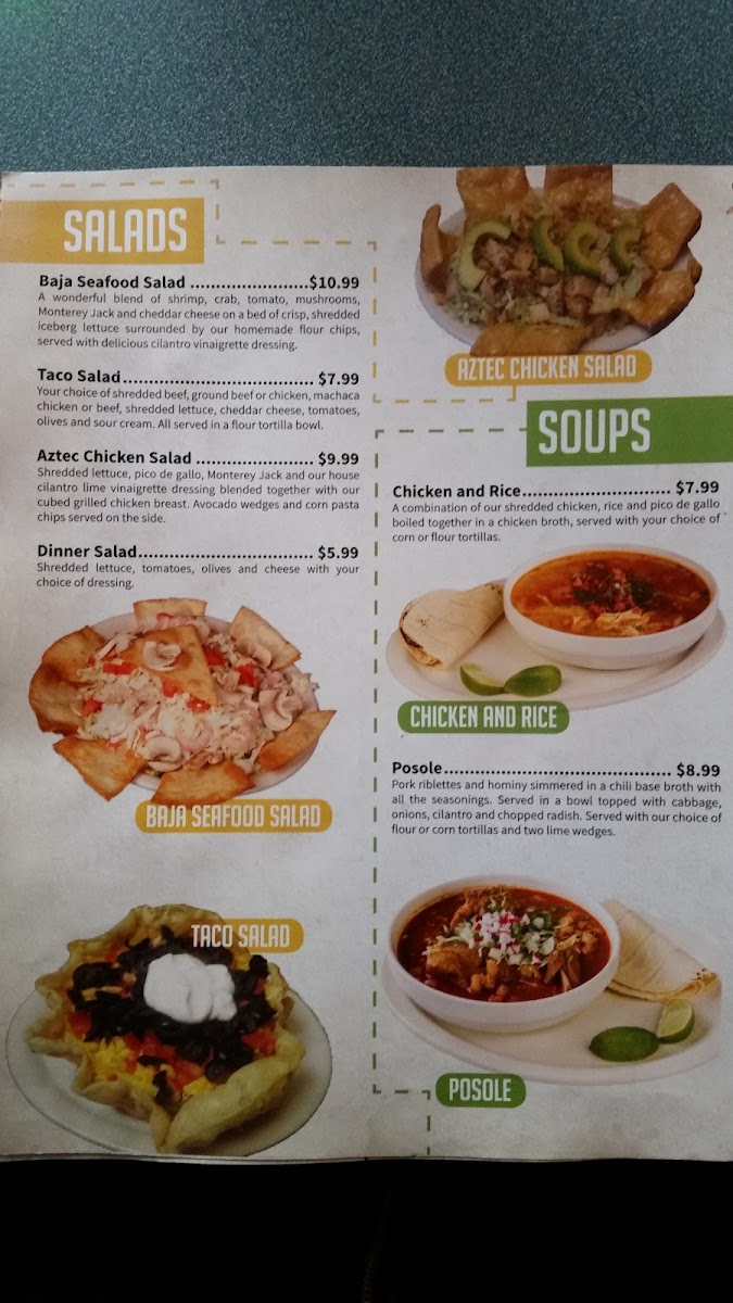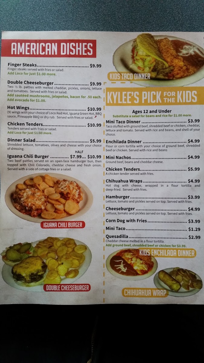 - Kylee's Picks for Kids: Features kid-friendly options like the Chile Colorado Burrito and the Taco Salad, all priced around $9.