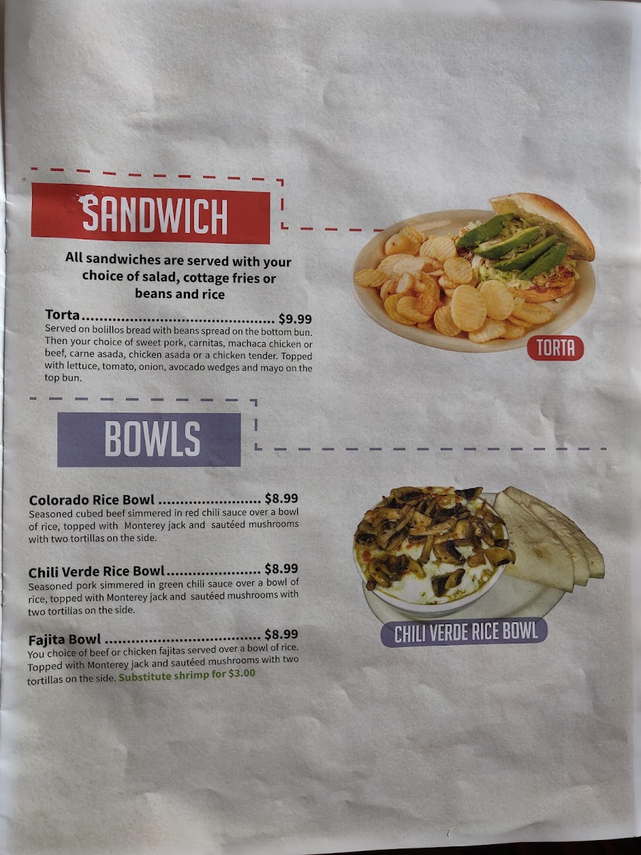 Flour tortilla stuffed with beans, rice, lettuce, onions, tomatoes, Monterey Jack and your choice of chile verde cubed pork in a mild green chili sauce or chile Colorado cubed beef in a mild red chili sauce Topped off with more verde or Colorado sauce and melted Monterey Jack cheese.